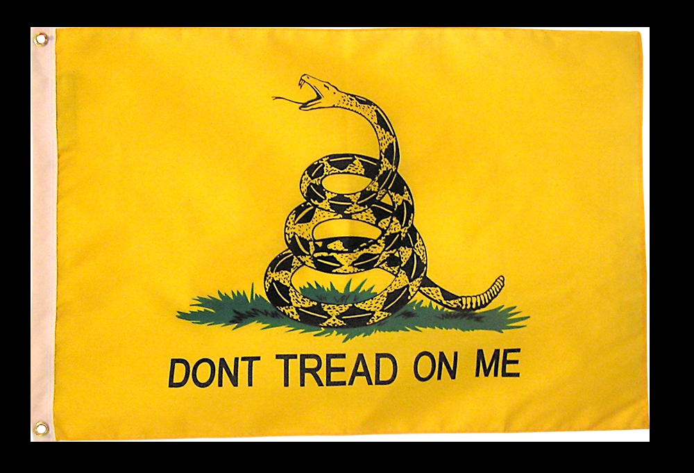 Made from 100% SolarGuard Nylon, America's No. 1 choice for Flags. Heading is sturdy duck with strong brass grommets. Durable and fast-drying. The rattlesnake Flags were the product of the southern colonies. One of the first of these was the Gadsden Flag, devised by Colonel Christopher Gadsden, a patriot of South Carolina, and presented to Congress with the expressed desire that it be designated as the Flag of the Commander of the American Navy. Congress thanked him for the idea and discussed Benjamin Franklin's analysis of the Rattlesnake, but declined to incorporate it into law. It is claimed that the Gadsden Flag was flown as the personal banner of commander Esek Hopkins, Commander of the American Navy. It was run up by John Paul Jones. The words, Don't Tread on Me, were evolved from an incident of the times. Lord North had declared that he would never relax his coercive measures until he had brought America to his feet. The sentence is an answer to his Highness and a warning as well. It said, that should he accomplish his purpose, it would be as dangerous to tread on America as it would be to tread on her symbol.